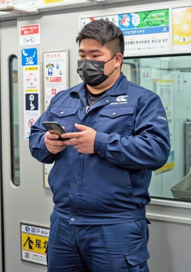 【デブ画像】作業着で電車通勤中のデブ君がかわいい!