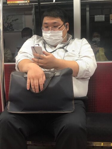 【デブ画像】マスクをしてスマホを弄る通勤途中の巨漢リーマンさん