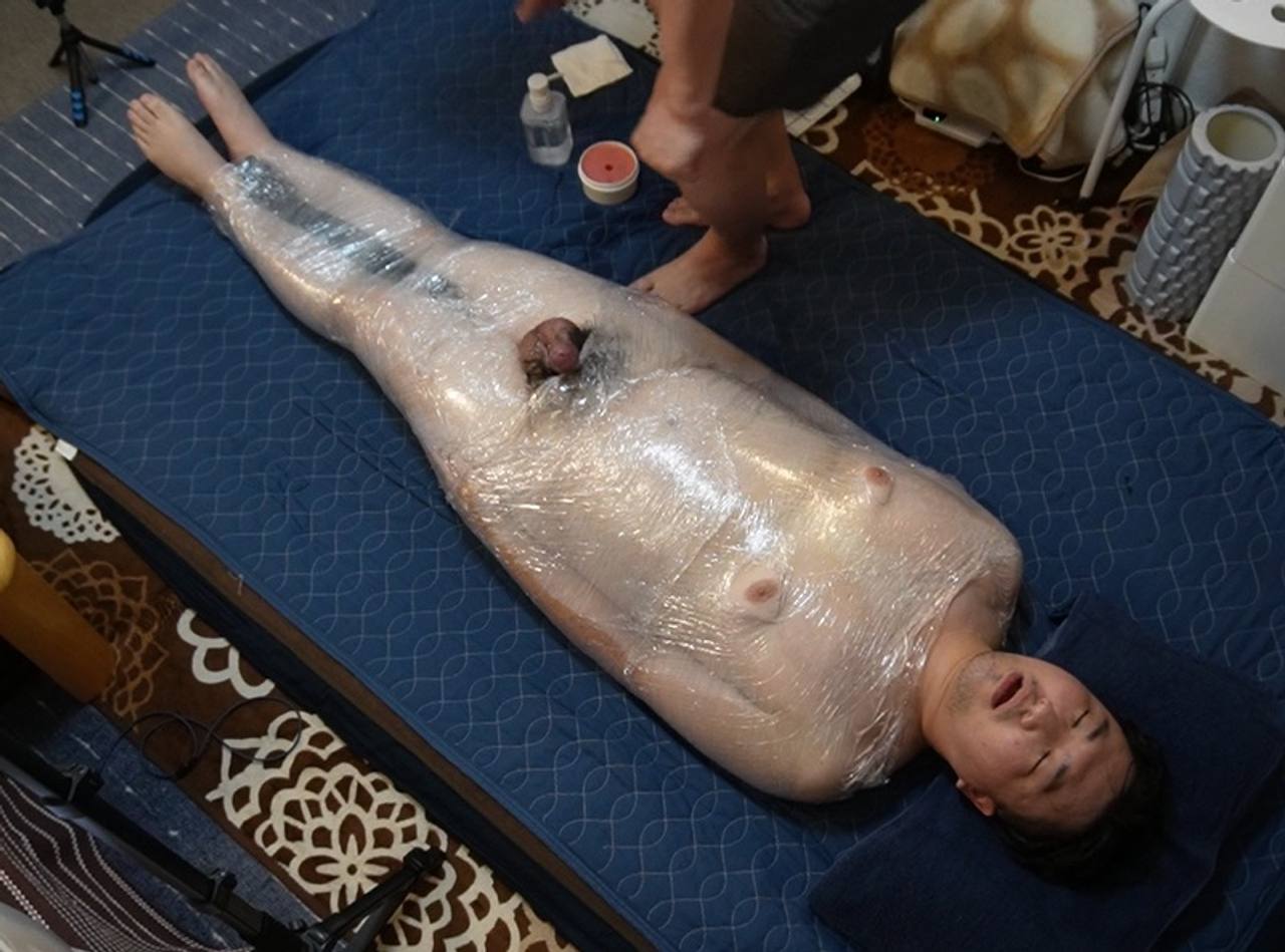 全身ラップで包まれて抵抗できなのにフル勃起!