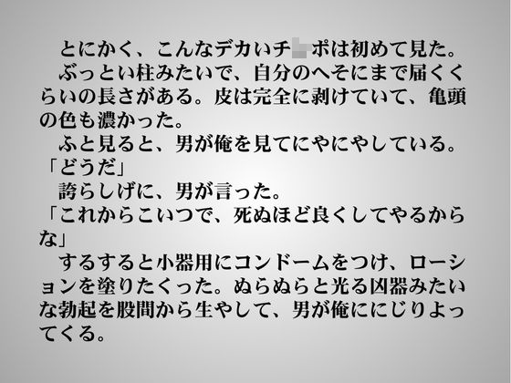 先輩の紹介でビデオモデルのバイトをすることになったアメフト部員。聞いていた話と違い、からみの撮影をすると聞かせれて怖気づくも、バイト代につられてOKしてしまう。しかし相手の男はたいへんな巨根で……