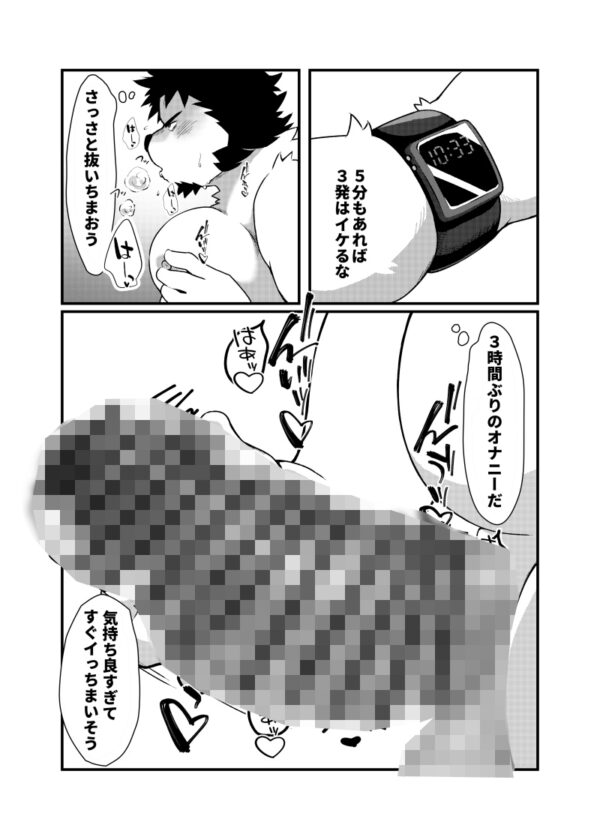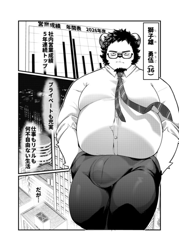 巨根がコンプレックスのライオン獣人が昼休憩中にオナニーして発散しているのが先輩にバレて、くんずほぐれつする漫画です。