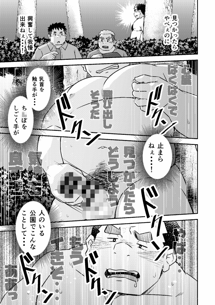 本作はBIGGYM発行のデブ専向けアンソロジーBOLD16に寄稿した『全裸公園』と描き下ろしの続編第2話と第3話を収録しています。