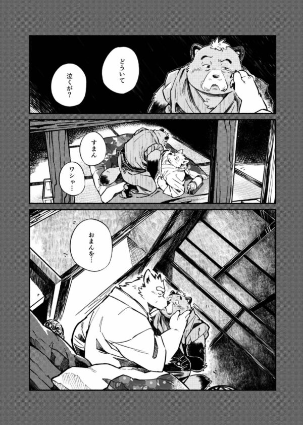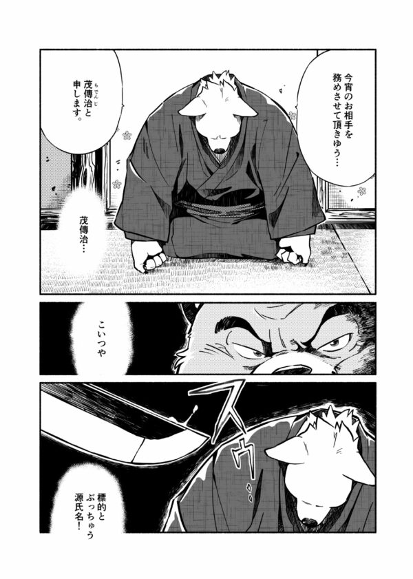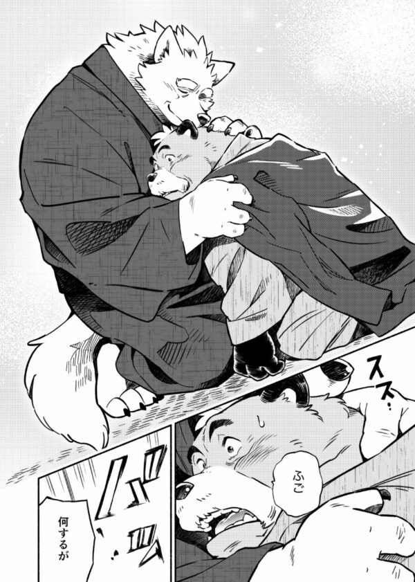 日本の江戸時代によく似た国で街そのものが遊郭となっている『狗津原』を舞台に楼客相手に体を売る獣夫、茂傳治と彼を暗殺に来た根無し古狸と呼ばれた男の物語「哮月異聞・序」